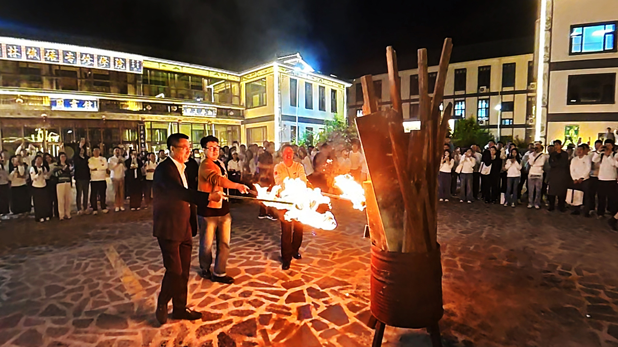 随着同学们陆续汇聚于篝火广场,星月交辉,银河清浅,张公一教授接过象征希望与传承的火把,与同学们一同点燃了篝火——万籁此俱寂,唯有星火跃动,点点汇聚,终成一片向上延展的温暖星河,顷刻间点亮了秋夜的天空。