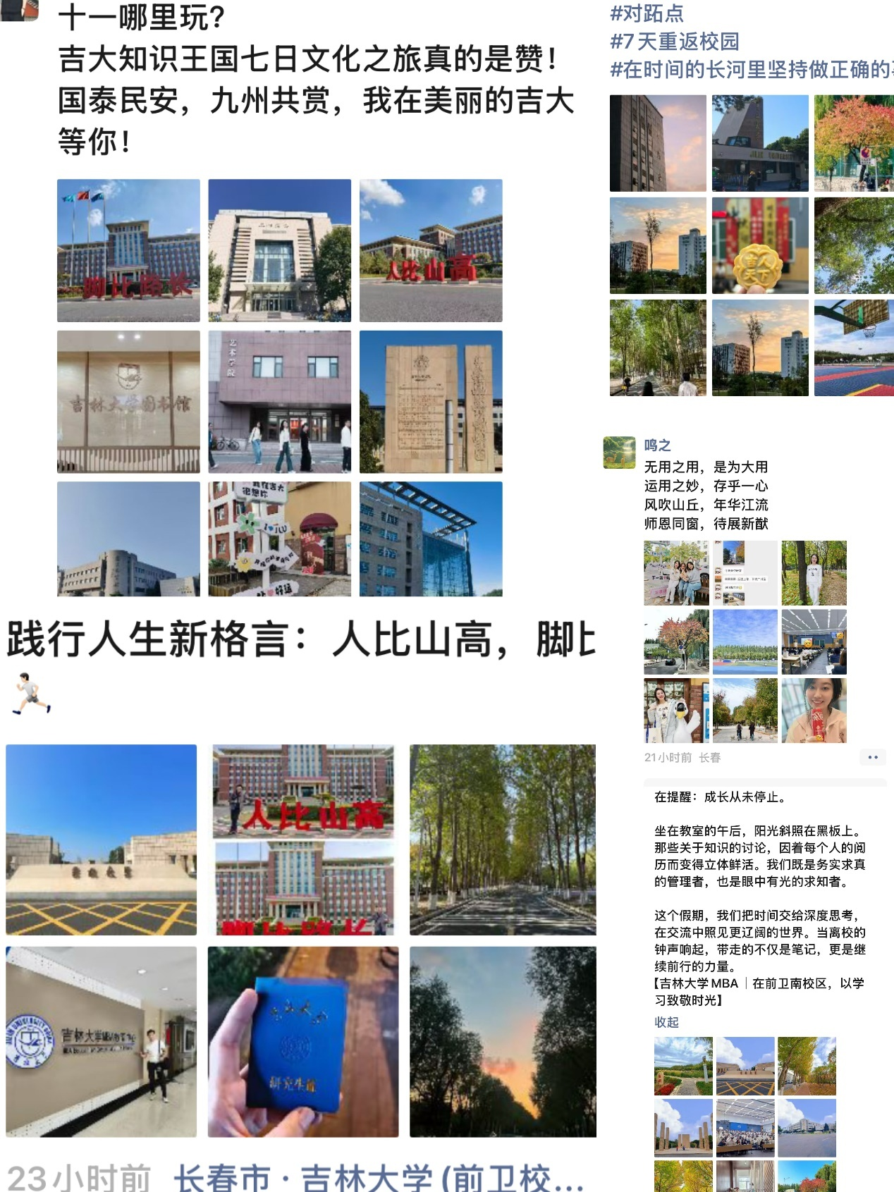 P7班江山:当国庆的红旗漫卷过长春的街道,北国春城正用中秋时澄澈的蓝天,给我们的吉大研究生生活,写就了一段从“陌生”到“亲近”的过渡,把七天的在校时间过成了读懂吉大、爱上长春的契机。这七天里,学院中心准备了丰富的课程和活动,忙碌的我们像是重新回到了青春校园的时光。直到离开前一天站在校园里看夜景,远处的路灯连成一片暖光,忽然懂得,研究生的十一假期不是用来“逃离”,而是用来“扎根”——在鼎新讲堂的开学仪式里,扎下对学术的敬畏;在逸夫楼与同窗学习的时光里,扎下与吉大最深的感情;在“北国春城”的温柔里,扎下对这座城市的喜爱。