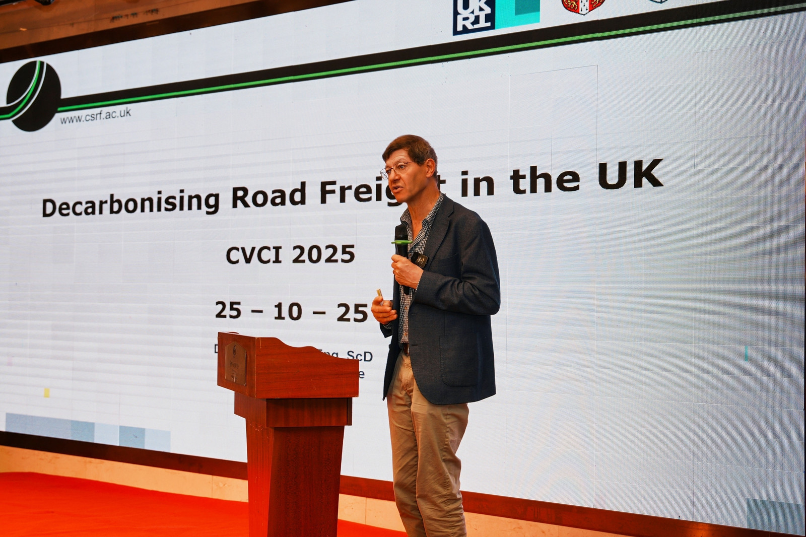 在为期三天的会议中,英国皇家工程院院士、剑桥大学DavidCebon教授率先作题为Challenges in Decarbonisation of RoadFreight(《道路货运脱碳面临的挑战》)的大会报告。报告分析了长途重型货运在实现脱碳过程中的技术瓶颈,比较了静态充电(使用充电桩)与动态充电(使用电气化公路运输系统)两种方案的可行性,指出后者在能效与基础设施适配方面具有更大优势,为道路货运的低碳转型提供了重要思路。