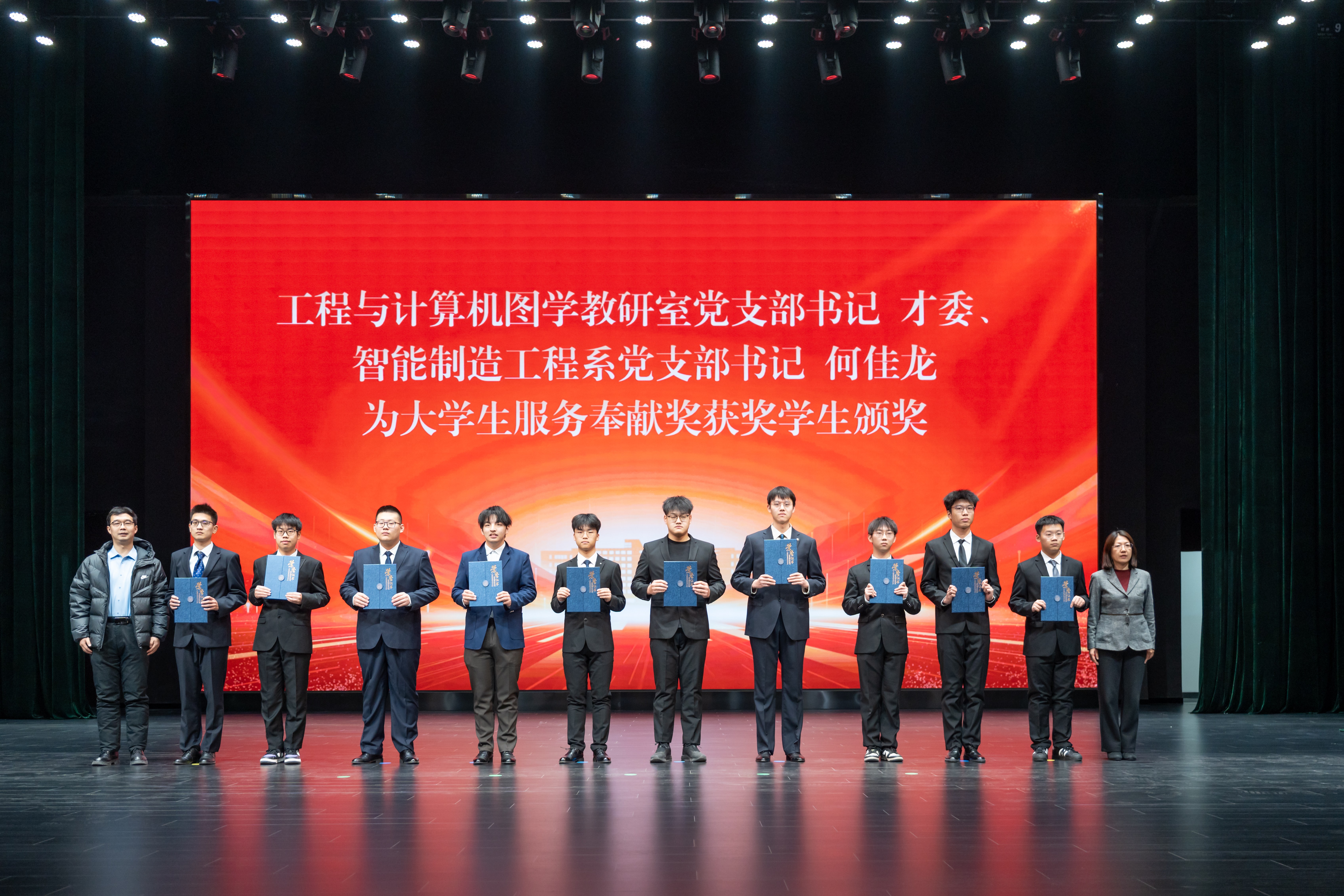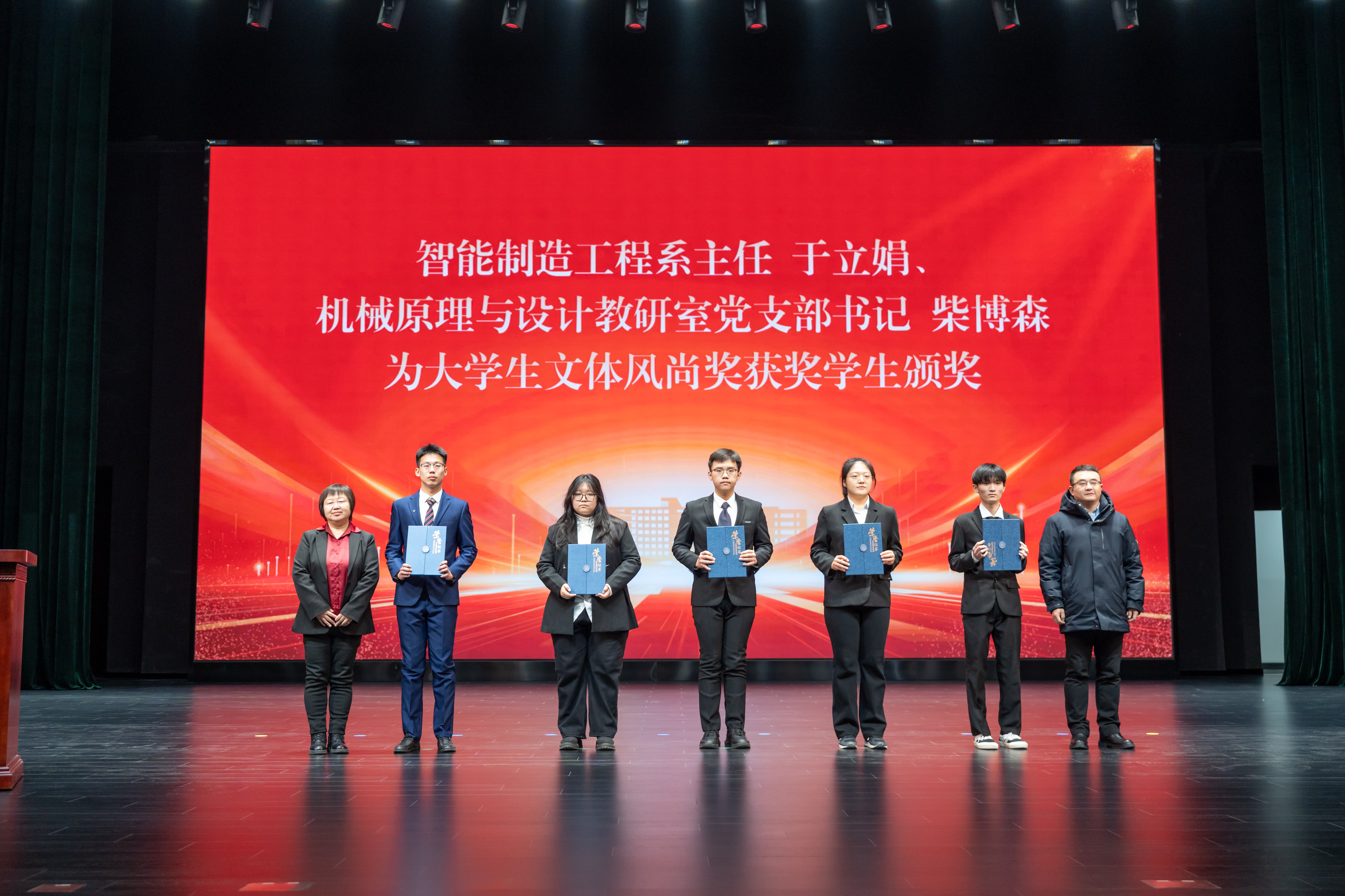 党委学生工作部副部长李洋为“聚力”优秀学生干部获奖学生颁奖。学院行政副院长马研为“启智”最具发展潜质奖获奖学生颁奖。机械基础教学中心副主任董景石为大学生创新菁英奖获奖学生颁奖。智能制造工程系主任于立娟、机械原理与设计教研室党支部书记柴博森为大学生文体风尚奖获奖学生颁奖。工程与计算机图学教研室党支部书记才委、智能制造工程系党支部书记何佳龙为大学生服务奉献奖获奖学生颁奖。