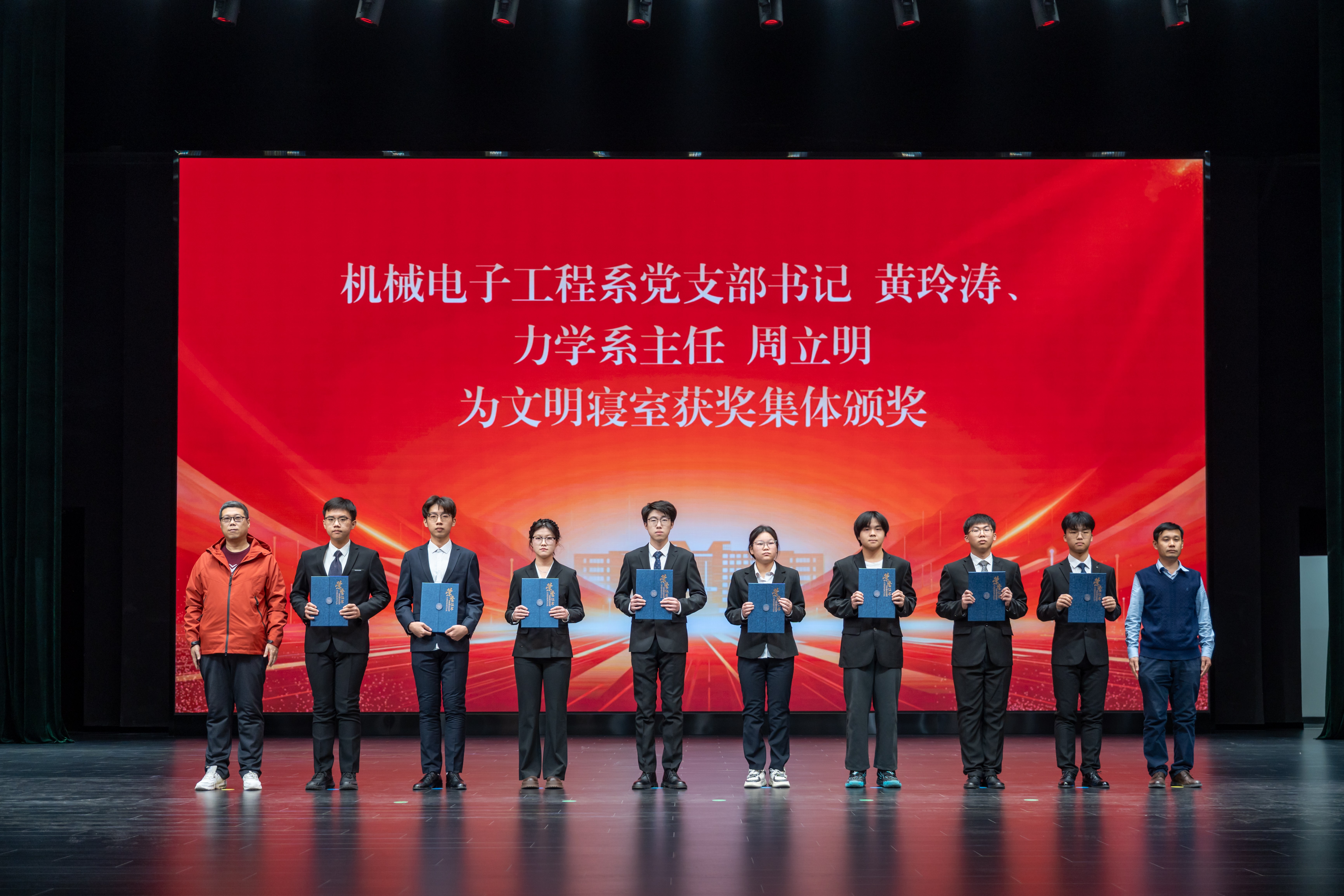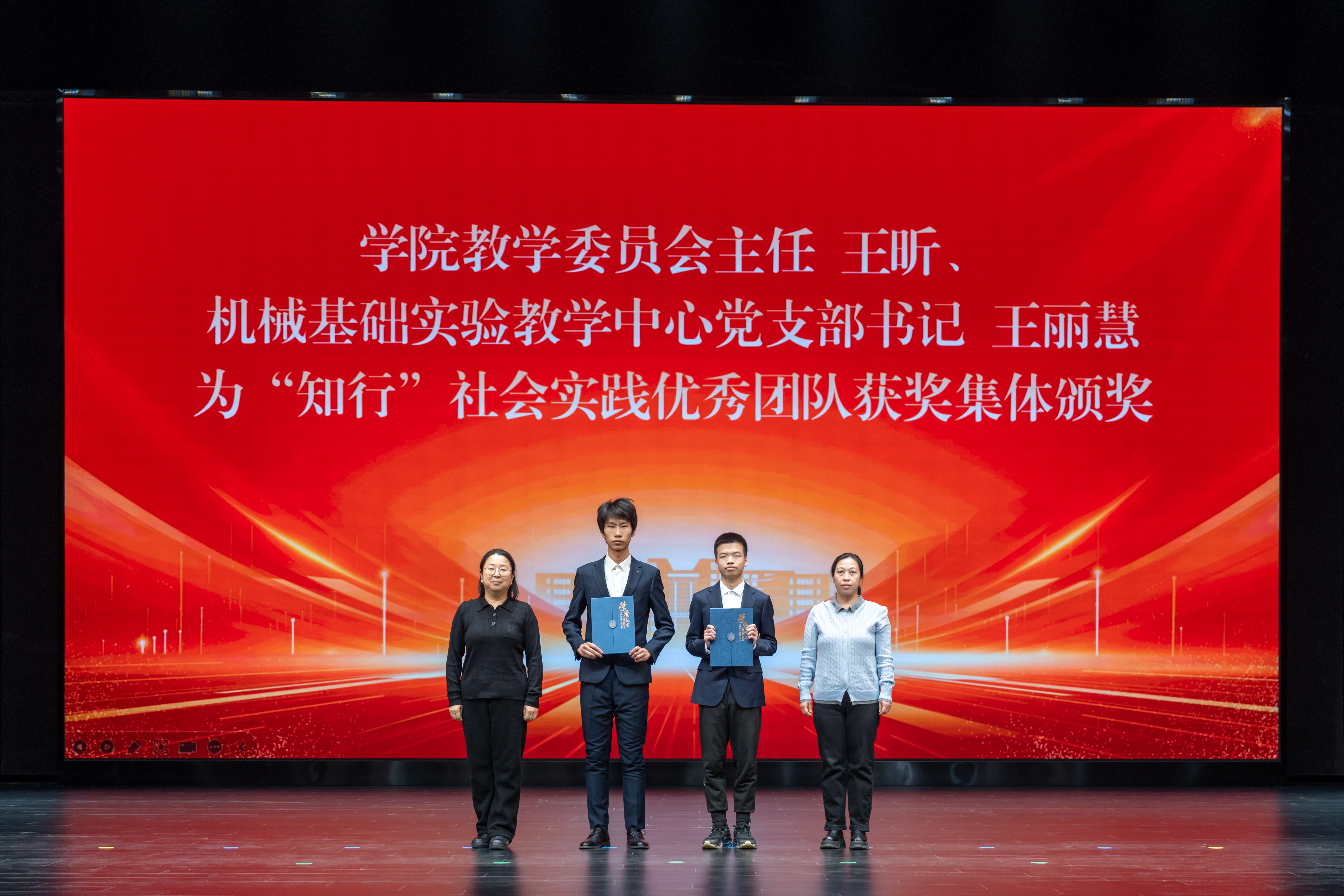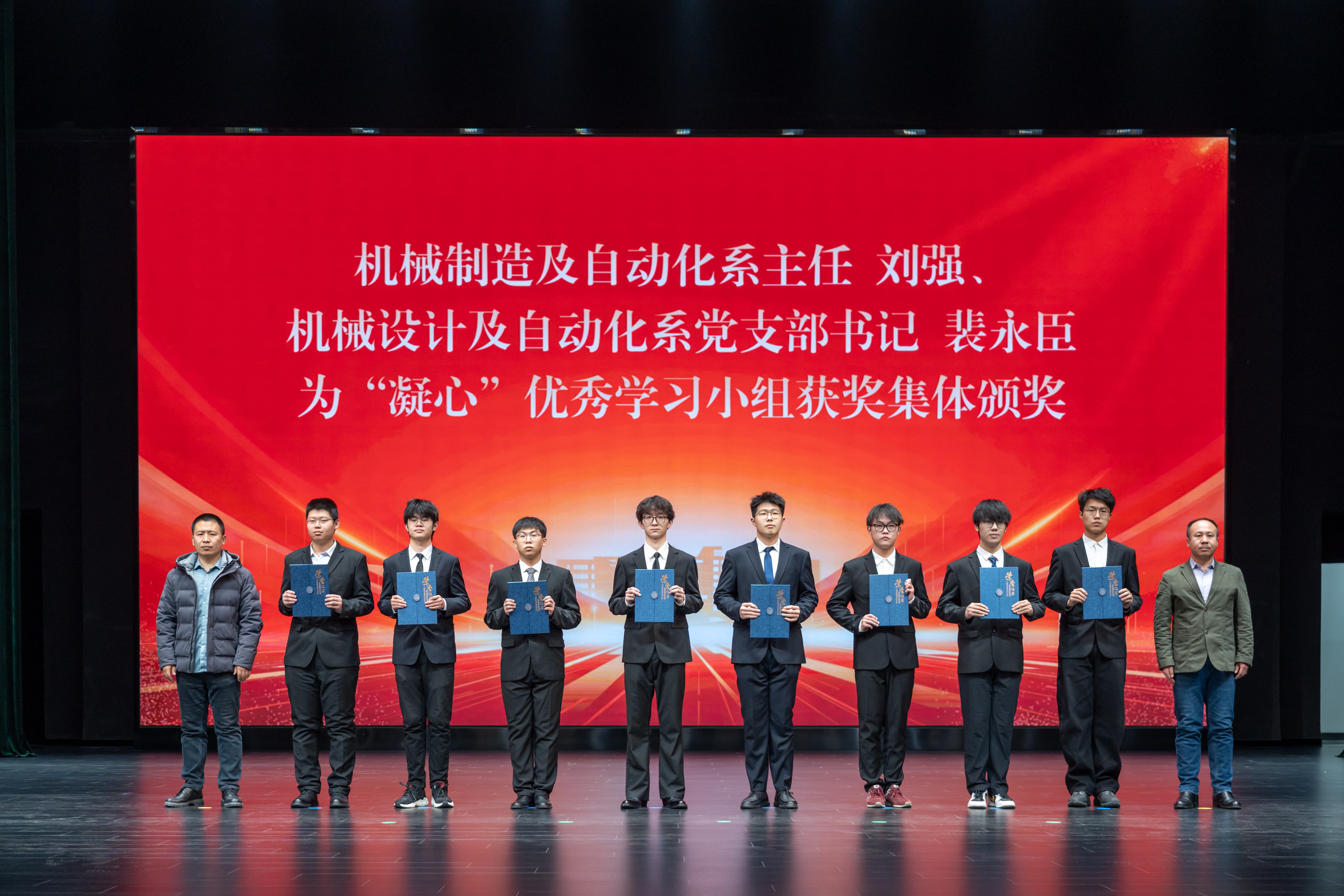 学院党委书记郑福胜为卓越班级获奖集体颁奖。机械制造及自动化系主任刘强、机械设计及自动化系党支部书记裴永臣为“凝心”优秀学习小组获奖集体颁奖。机械电子工程系党支部书记黄玲涛、力学系主任周立明为文明寝室获奖集体颁奖。学院学术委员会主任王昕、机械基础实验教学中心党支部书记王丽慧为“知行”社会实践优秀团队获奖集体颁奖。