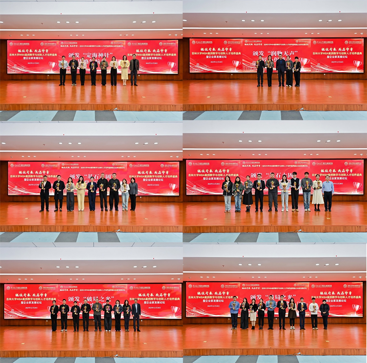 吉林大学商学与管理学院党委书记赵军、党委常务副书记、纪委书记丰硕、常务副院长隋建利、党委副书记李帅、党委副书记兼副院长马腾、副院长马捷、王金明、张小宇、隋祎宁,MBA教育中心副主任张越、印重、林晶,瑞华集团全球合伙人姜涟,成都清电易科技有限公司董事长屈东明,南昌丰睿企业管理咨询有限公司总经理胡青,一汽红旗工厂智造中心高级专家齐嵩宇等校外合作导师、获奖师生及校友近200人共襄盛会。盛典由吉林大学MBA教育中心主任张公一主持。