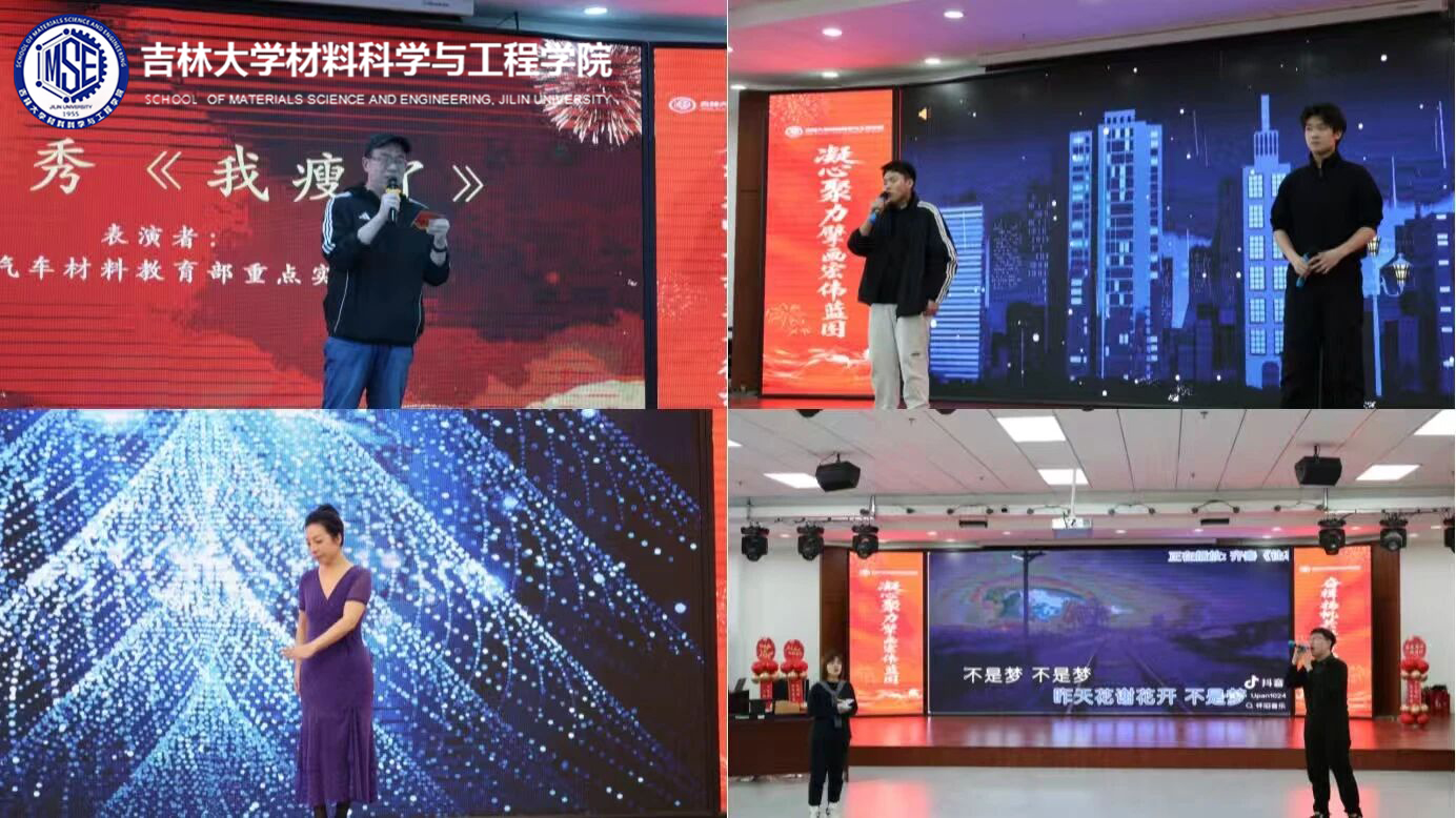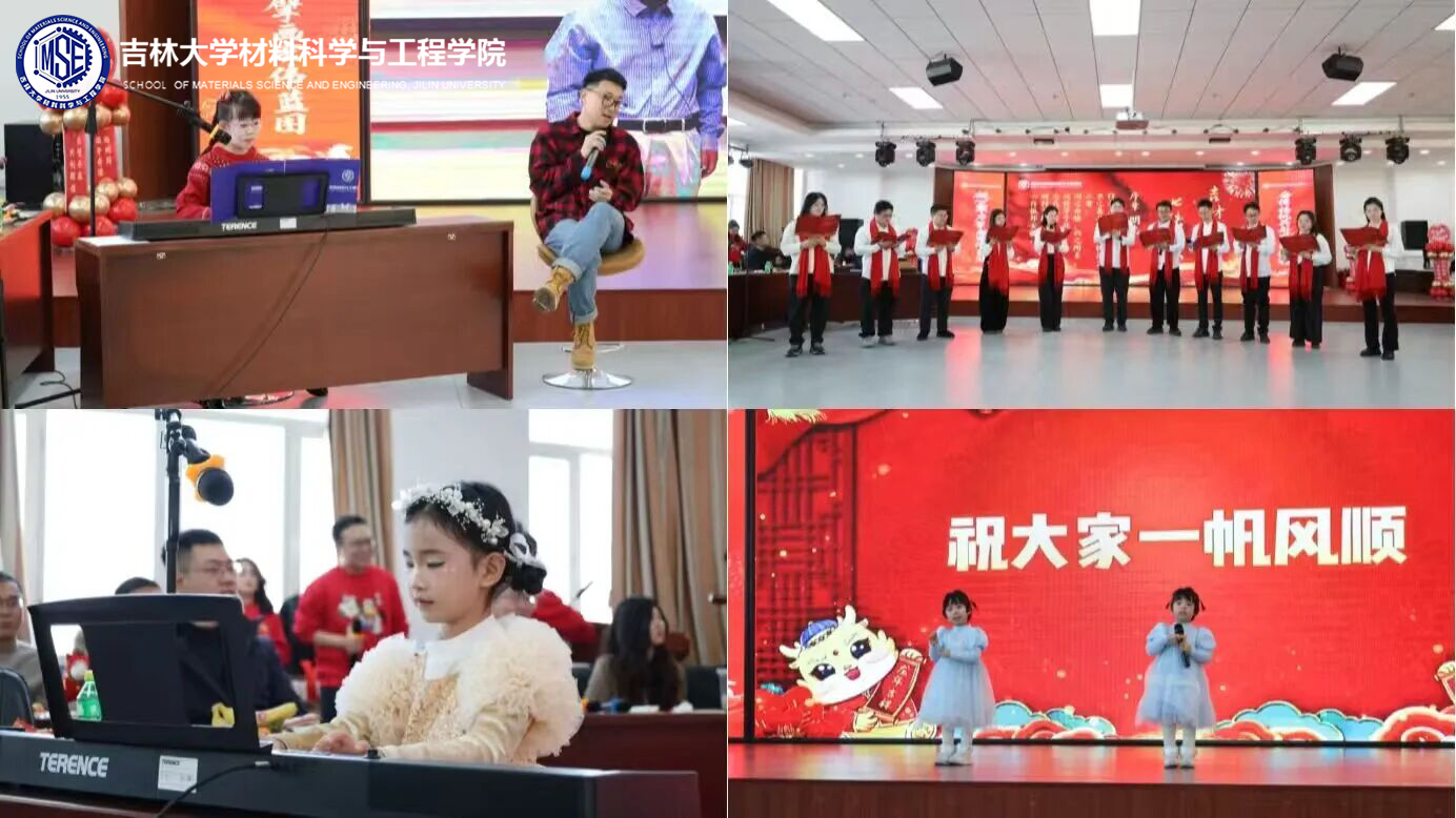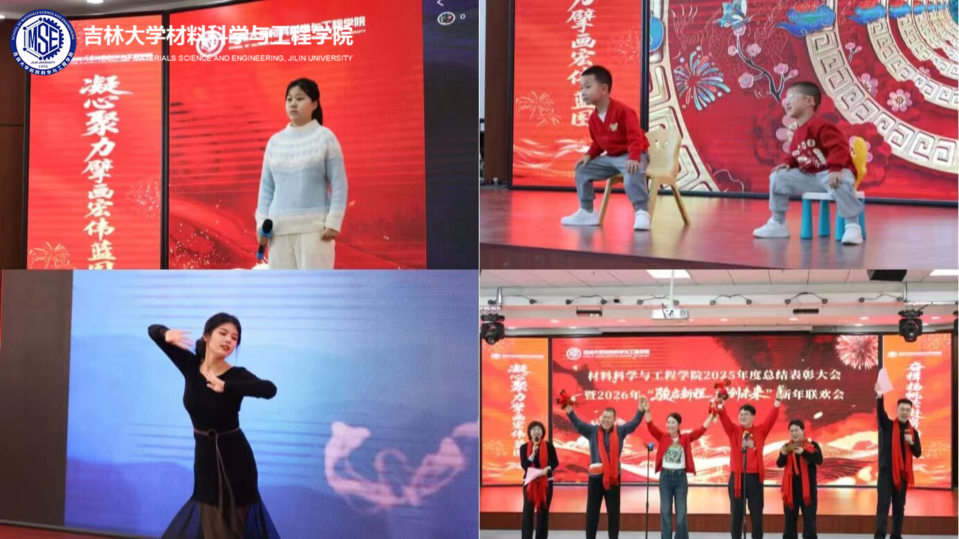 联欢会的文艺表演环节精彩纷呈,充分展现了学院师生的多才多艺与精神风貌。歌曲《亲爱的你啊》以温馨的旋律拉开表演序幕;新入职教师带来的诗朗诵《吉材赋·七秩长歌》,深情回顾学院七十载发展历程;童趣满满的“吉星贺岁”环节中,小朋友们的钢琴独奏、成语拜年、独唱等节目轮番上演,灵动的表演让现场洋溢着童真与欢乐;独舞《芒种》将古典舞的柔美与灵动展现得淋漓尽致;三句半《材料学工这一年》则以幽默诙谐的方式展现学工日常;脱口秀《我瘦了》更是将现场欢乐氛围推向高潮。此外,《无名的人》《往事随风》《凝眸》等歌曲演唱深情动人,伦巴舞的表演优雅洒脱,合唱《一路生花》传递出对未来的美好憧憬。最后,学院领导班子合唱的《材料荣光》,更是将联欢会的氛围推向顶点,歌声中凝聚着对学院发展的美好祝福。