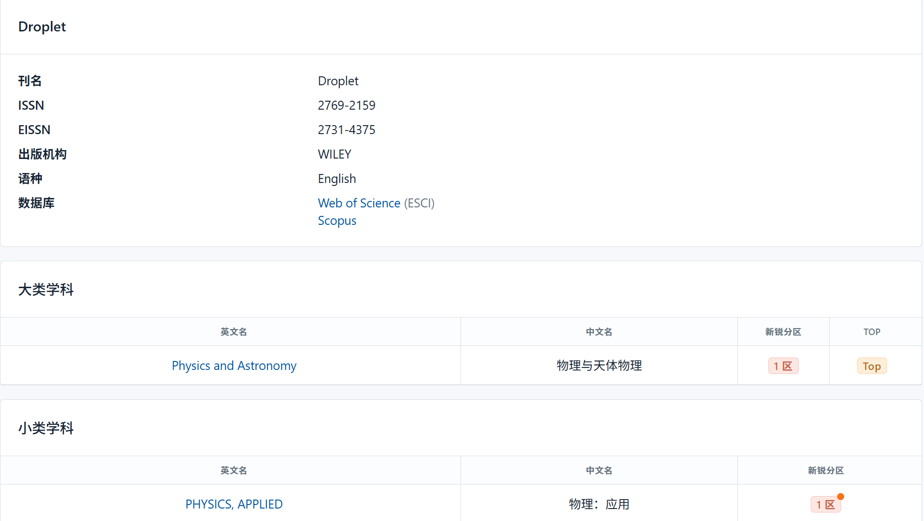 近日,《新锐期刊分区表》正式发布。由我校仿生科学与工程学科主导创办的国际学术期刊Droplet《液滴(英文)》,成功入选“物理与天体物理”大类1区Top期刊(小类“物理:应用”1区),标志着期刊已跻身本领域高质量学术平台行列。