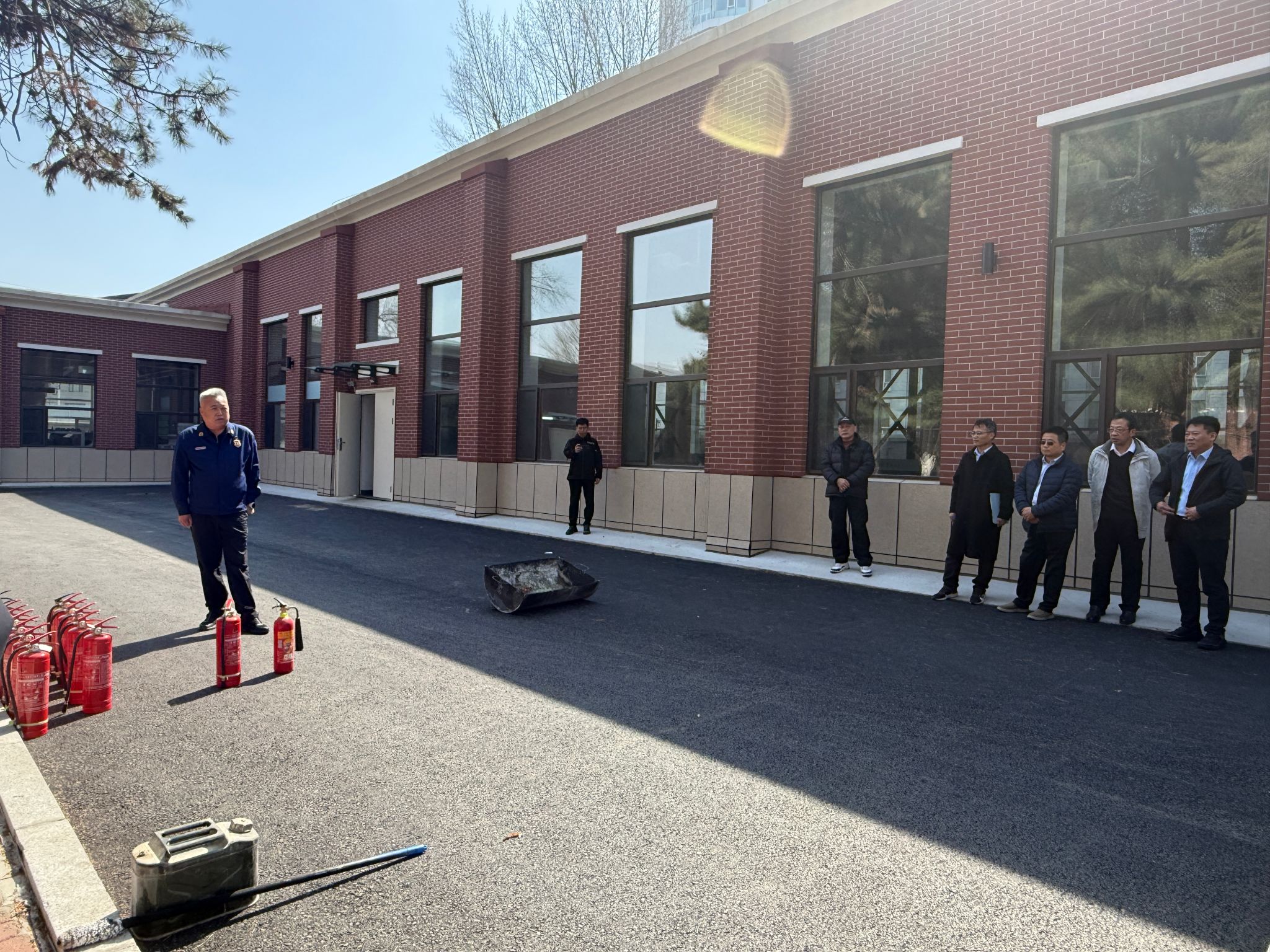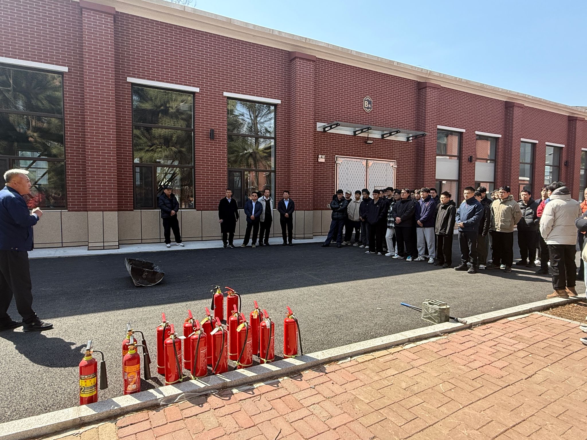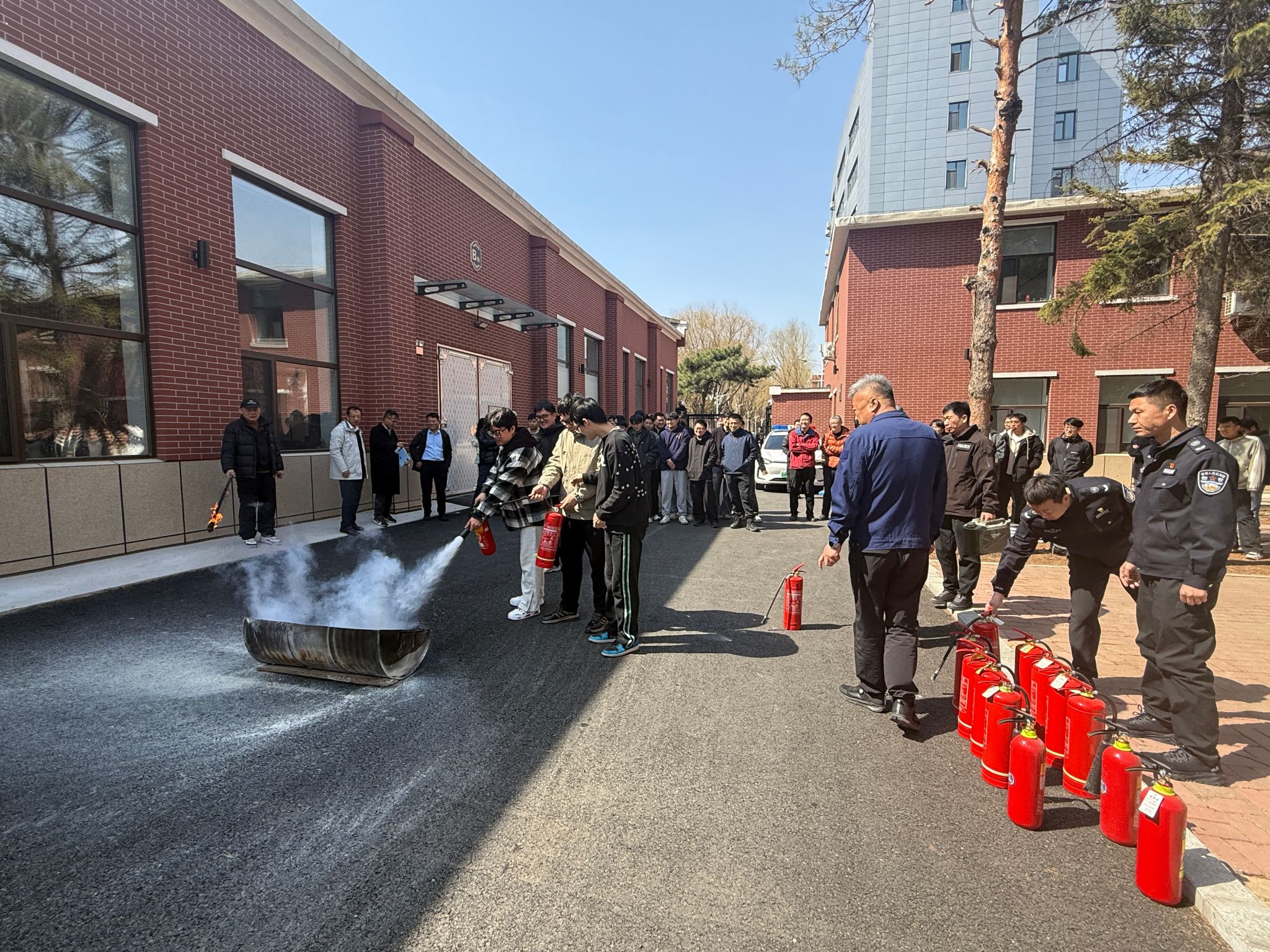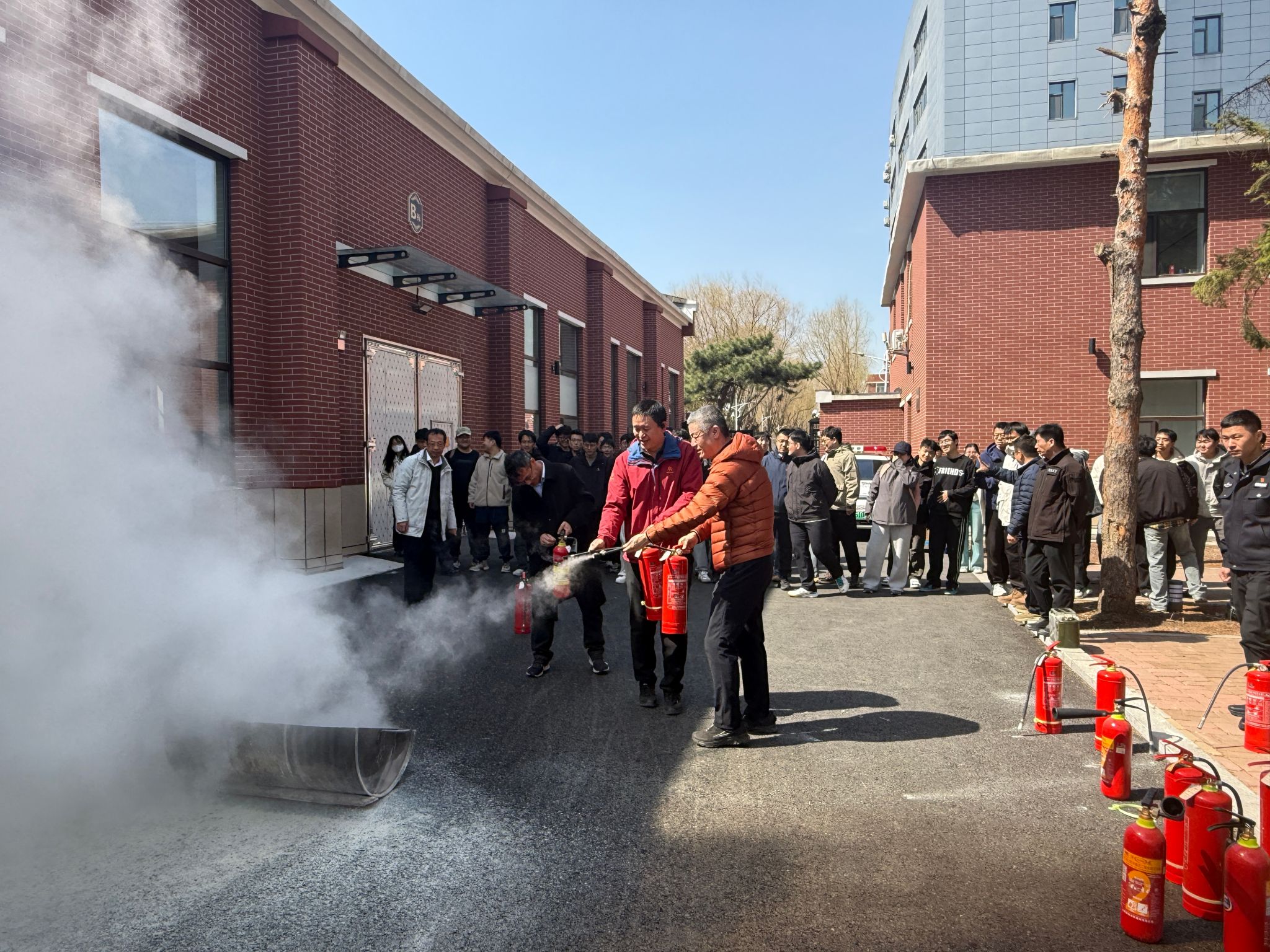 演练伊始,东区保卫办消防科王中刚老师结合近期火灾案例进行警示教育,并讲解了各类灭火器的适用范围及标准操作步骤。随后,左文杰向在场师生重点强调了灭火器操作的简易口诀:“一提二拔三压”,帮助大家快速掌握灭火器要领。在王中刚老师的专业指导下,师生们分组进行了灭火实操演练。师生面对模拟火点,按照操作规程,迅速有效地将火源扑灭,通过亲身体验,切实掌握了初期火灾的扑救技能和灭火器的正确使用方法。
