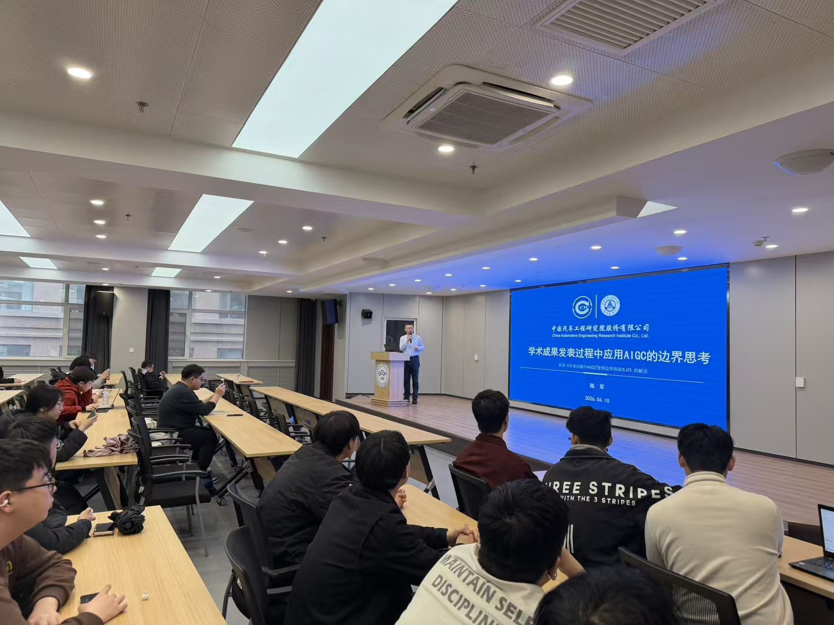 4月10日下午,汽车工程学院“薪传砥砺,‘研’途筑梦”研究生学术大讲堂第六十七讲在汽车大楼214报告厅举行。本次活动特邀中国汽研科技创新部资深专员、《汽车工程学报》编辑部主任陈军,作题目为“学术成果发表过程中应用AIGC的边界思考”的学术报告。
